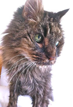 I would have never known about the kitten if Merritt — the neighbor child — hadn’t told me, because he was hiding under a porch, quietly shaking with shock as he slowly waited for what would have been sure death. It was night when I pulled him out from under the porch. I’d never called my vet at home, but decided this was an emergency worth making an exception for. He explained how to take care of the kitten immediately and said to meet him at his clinic first thing in the morning.