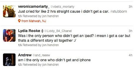 When Christmas came and went over the weekend, not everyone got the gifts they were hoping for. Many of them took to Twitter to whine to their friends about what they didn’t get. It seems that a lot of poor spoiled children didn’t get the iPhones and iPads they wanted. One abused young woman said, “Was i the only person who didn’t get an ipad? i mean i got a car but thats a different story all together.”