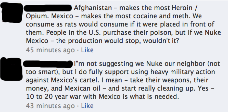 How do you respond to that? How do you explain to people that this sort of insanity wouldn’t work and it’s immoral, too? I have no idea. I don’t believe it’s possible to change their beliefs. People who believe such irrational, immoral and disturbing things aren’t suddenly going to see the light. And while there might not be a majority who are ready to go to war with Mexico over drugs, I think you’d be surprised just how many would favor some sort of military action if you made the fight about drugs and immigration.