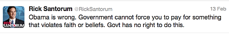 If Santorum and other conservatives believe that government can’t force us to pay for things that violate our beliefs, does this mean he’s going to fight to get refunds for those of us who’ve had to pay for wars against our will? Is he going to try to get us refunds for the money that’s been taken from us to give to other countries in the form of handouts and military hardware? Is he going to prevent our money from being used to support various kinds of social and economic welfare programs that we don’t believe in?