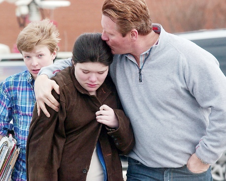 Roughly 1,200 students and their parents spent the rest of the day being grateful they weren’t directly affected by the shooting — such as the student and her father above — but a few families weren’t so fortunate. Two students died and three others are wounded.