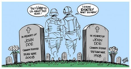 More of those in the armed services have grave reservations about the way the military is used today. Some might be blindly supportive of the militaristic view of their civilian bosses, but a substantial number know better. And as many of them finish their time in the military and reflect on what they’ve seen and heard, they come to view things in very different ways. This is what a veteran said to me Monday in discussing the illustration above: