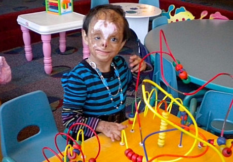 In 2009, three baby girls were among the victims of a missile attack launched on their village in Pakistan. They were badly burned and someone placed the three into a trash bin to die. A volunteer doctor from House of Charity found them and tried to save the little girls. Two of them died, but one of them, Shakira, lived. Barely.