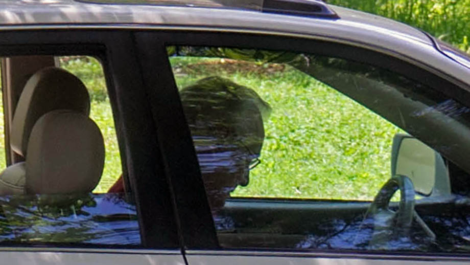 After a few minutes, the knocking stopped. I looked out to see him walking back to his car. Then he sat in the car looking at his iPhone for a couple of minutes. Then I received an email — the one he was writing when I quietly shot the photo — saying that he would give me five minutes to come out. He sat in the car for five minutes and then left.