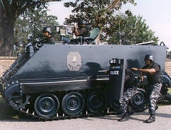 A suburb north of Birmingham has some sort of tank that the federal government gave to it. Since it’s not armed, I suppose it’s really just an armored personnel carrier, but it’s been referred to as a tank around the city. So why does a small police department in a sleepy Alabama suburb need an armored personnel carrier? A city official told me that the city had no use for it, but it was “free” — from the feds, of course — so why not take it? It just stays parked except for parades, as far as I can tell. (The picture here is from a similar vehicle used by police in Charleston, S.C.)