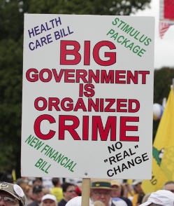 The problem isn’t the unethical people we send to be members of Congress or to run various parts of government. The problem is the system itself. Getting rid of Bachus — or even throwing out all of the incumbents and replacing them with new people — doesn’t fix the basic flaws in the system. The core issue that we give a group of people unlimited power to grant favors and do whatever they decide to do to the rest of us. Whoever we place in that position is going to become corrupt, because what we’re sending them to do is immoral in the first place. The sign here would be more accurate if you struck the word “big” and replaced it with “coercive,” but coercive government is still a criminal enterprise even if it’s small.