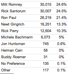 So the long national nightmare called Campaign 2012 continues. The first chapter is closed and the road looks a lot more clear now. It will settle into a race between Romney and whatever candidate conservatives choose to coalesce around. There’s a slight chance it could still be Gingrich, but I don’t think so. (Gingrich is probably going to stick around and see how he does in South Carolina and Florida.) It’s more likely that social conservatives will rally around Santorum, especially in southern states. Bachmann has already dropped out. I wouldn’t be surprised to see Perry drop out any day now, too.
