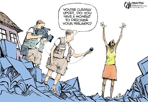 Last week, we had some tornadoes in my area. As far as I can tell, the only person who was killed was an attractive 16-year-old girl who lived not far from me. I happened to hear one of the local television stations do multiple “news” stories about her death a couple of days later. There was no news. It was just shameless pandering to emotions. The reporter and camera were at the school where the girl had attended, so they were trying to find people to emote on screen for them. There was absolutely nothing to say, but an attractive young white girl died, so this ought to be good for ratings. I’ll bet a lot of people watched it. But it’s not news. (Click the cartoon above for a perfect illustration of what’s standard practice now.)